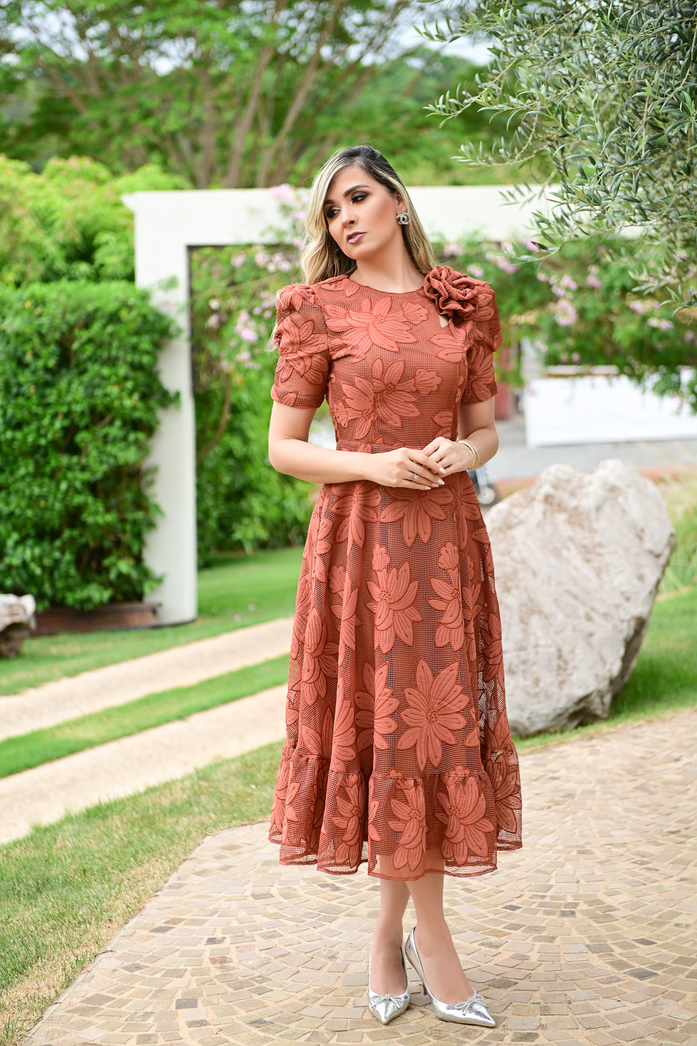 Título: Vestido Jade Max Midi em Tela Bordada com Flor Removível
